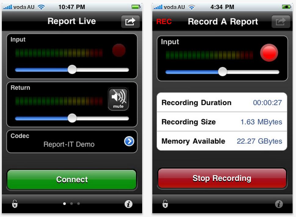 Charlie Mayer, director of operations for NPR News, says Report-IT is the ideal way to deal with bad Internet connections or drop-outs during live-to-tape phone interviews. The audio is recorded simultaneously in studio and on the iPhone. The iPhone recording is FTP’d back to the studio afterwards “to sync with the original recording if artifacts or dropouts occurred during the live interview.”